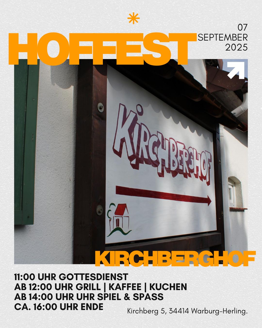 Wir laden ein zum Hoffest am 07.09.2025 auf den Kirchberghof. Um 11 Uhr starten wir mit einem gemeinsamen Gottesdienst im Innenhof des Geländes. Anschließend bieten wir mit einem bunten Grill- und Kuchenbuffet die Möglichkeit zu Verweilen. Ab 14 Uhr beginnen zahlreiche Aktionen rund um den Hof und wir laden zum Erkunden und Ausprobieren ein. Bis ca. 16 Uhr wollen wir gemeinsam feiern und freuen uns über zahlreiche Gäste.