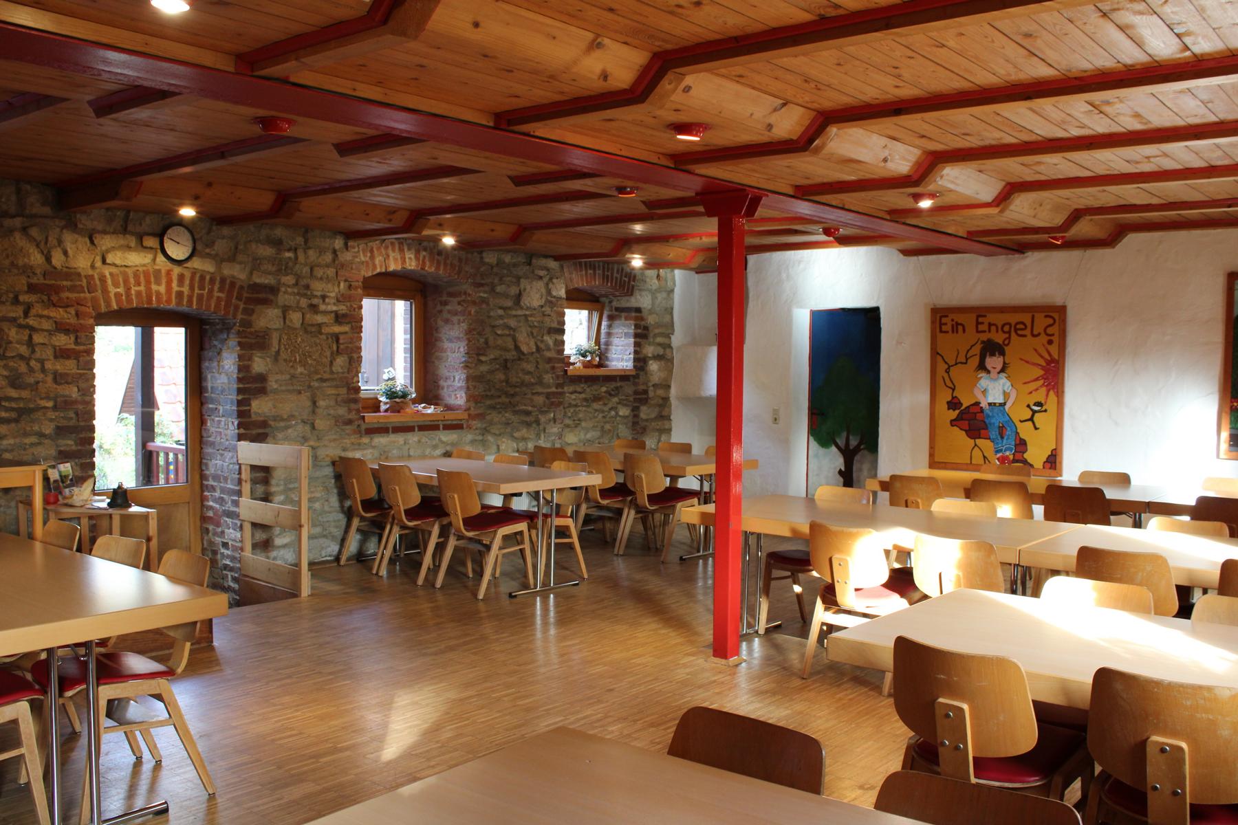 Unser Speiseraum im Kuhstall EG ist gleichzeitig auch als Aufenthaltsraum, sowie bei Vollbelegung des Hofes, als Gruppenraum nutzbar. Bis zu 70 Personen haben hier Platz.